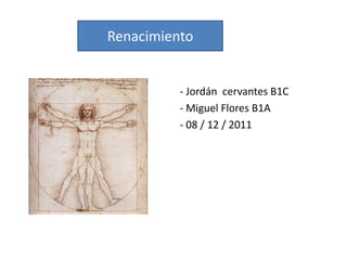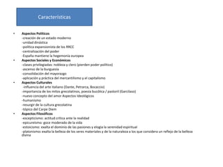 Este documento resume las principales características del Renacimiento en España. Aborda aspectos políticos, sociales, económicos, culturales, ideológicos y filosóficos de esta época. También describe los desarrollos en poesía, prosa, teatro, ciencia, arquitectura, viajes, roles de género y cultura durante el Renacimiento español.