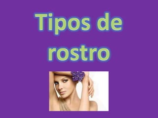 Este documento describe los diferentes tipos de rostros: ovalado (ideal), redondo, cuadrado, largo y estrecho, en forma de corazón, triangular y en forma de diamante. Cada tipo se caracteriza por la forma y anchura relativa de la frente, pómulos y barbilla, así como por la acumulación de tejido adiposo y estructura ósea. El documento proporciona detalles sobre cada tipo para ayudar a identificar el tipo de rostro de una persona.