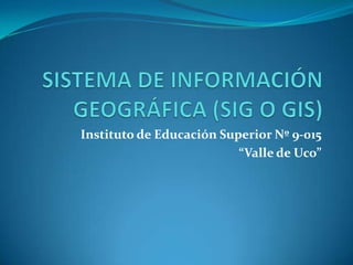 El documento define el Sistema de Información Geográfica (SIG) como un conjunto de hardware, software y datos geográficos utilizado para almacenar y analizar información espacial. Explica que los SIG se usan para resolver problemas complejos de planificación y satisfacer necesidades de información en campos como la investigación científica, la gestión de recursos, la arqueología y la viticultura. También describe las técnicas de creación y representación de datos raster y vectoriales usadas en los SIG.