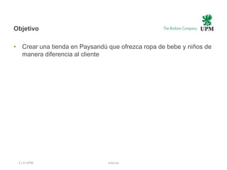 Este documento describe los planes para abrir una tienda de ropa para bebés y niños en Paysandú, Uruguay. Se establece el objetivo de ofrecer ropa de una manera diferente para los clientes y se indica que la tienda abrirá el 18 de agosto de 2011, con la expectativa de muchas sorpresas en el 2012.