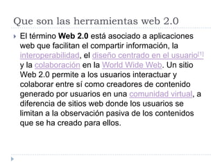 Este documento describe las herramientas web 2.0, que permiten a los usuarios interactuar y colaborar generando contenido en comunidades virtuales, a diferencia de sitios donde solo observan contenido. Ofrece ventajas como software gratuito y actualizado disponible desde cualquier lugar y dispositivo, permitiendo la colaboración de múltiples usuarios. También señala posibles desventajas como la privacidad de datos con terceros y cambios en las condiciones del servicio.