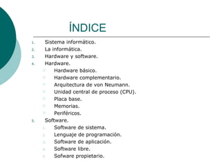 El documento habla sobre los componentes básicos de un sistema informático, incluyendo el hardware y el software. Describe el hardware como los componentes físicos como la unidad central de proceso, la memoria, la placa base y los periféricos. Explica que el software incluye el sistema operativo, los lenguajes de programación y las aplicaciones. Finalmente, distingue entre software libre y propietario.
