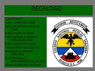 Este documento presenta un decálogo de 10 normas de conducta para estudiantes junto con las sanciones correspondientes a cada una. Las normas incluyen no pelear, comer o decir groserías en clase, jugar, entrar a páginas pornográficas, hablar en clase, dañar equipos, cuidar la higiene, robar implementos o dormirse en clase. Las sanciones van desde llevar al estudiante con el coordinador hasta bajar la nota actitudinal o procedimental, decomisar objetos, llamar a los pad