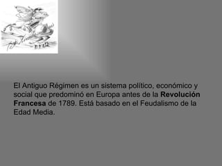 El Antiguo Régimen en Europa antes de la Revolución Francesa se caracterizó por una demografía y economía agrarias, una estructura social estamental y un gobierno absoluto. La población crecía lentamente debido a las altas tasas de mortalidad, especialmente infantil. La economía se basaba principalmente en la agricultura a pequeña escala y el comercio a larga distancia, con poca industria y desarrollo urbano. La sociedad estaba dividida en estamentos rígidos. El gobierno era absolutista, con mon