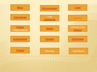 Existen varios tipos de carrocerías para automóviles, incluyendo monovolúmenes, tres volúmenes, carrocerías autoportantes, tubulares, sedanes, familiares, cupés, hardtops, vehículos todoterreno, camionetas y hatchbacks. Cada tipo se distingue por la integración y número de volúmenes, puertas laterales, y si la carrocería soporta la estructura del vehículo.