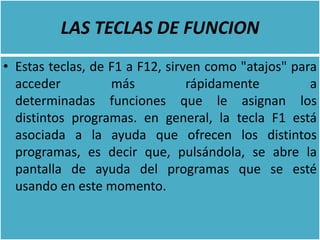 El teclado permite introducir datos a la computadora y se conecta mediante un puerto. Contiene teclas para letras, números, signos y funciones especiales. Las teclas F1-F12 sirven como atajos para acceder rápidamente a funciones de programas. Otras teclas como Mayúsculas, Alt, Control, Tab, Escape, Delete, Insert, Home, Espaciadora, Bloq Mayús, Enter y Teclas Windows tienen usos específicos.