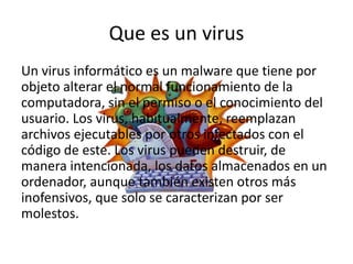 El documento habla sobre seguridad informática. Explica qué es un virus informático y los diferentes tipos como troyanos, gusanos, bombas lógicas y hoaxes. También menciona algunos antivirus conocidos como Norton, Avast, Avg y Kaspersky. Define los términos hacker, cracker y licencia de software. Por último, resalta la importancia de la seguridad informática para proteger la información y datos de una empresa.