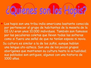 Los hopis son una tribu india americana conocida por vivir en la meseta del Colorado en EE.UU. y mantener su cultura antigua de hasta 1000 años, incluyendo costumbres como las coletas de solteras. Aunque hablan una lengua diferente a los zuñis, comparten una cultura similar y actualmente su población es de unos 10.000 miembros.