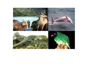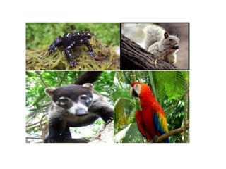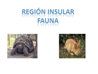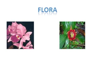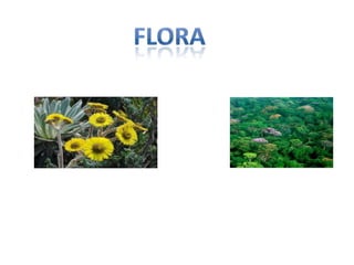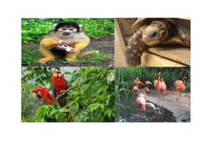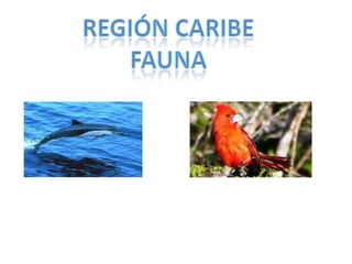 La región andina tiene una gran variedad de fauna incluyendo aves como el cóndor y águila, mamíferos como serpientes, y plantas como orquídeas, musgos y palmas debido a su clima variable. La región caribe tiene especies de animales en peligro de extinción como el mico tití, caimán y boca chico. La región también tiene flora única como el manglar y frailejones. La región insular se caracteriza por su diversidad de peces, tortugas, caracoles y langostas.