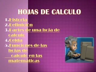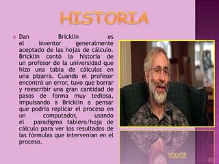 Dan Bricklin inventó las hojas de cálculo para replicar el proceso de cálculos en una pizarra de forma digital. Una hoja de cálculo es un programa que permite organizar y manipular datos numéricos y alfanuméricos en celdas dispuestas en filas y columnas. Las celdas son la unidad básica donde se insertan valores y fórmulas para realizar cálculos complejos y dibujar gráficas.