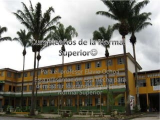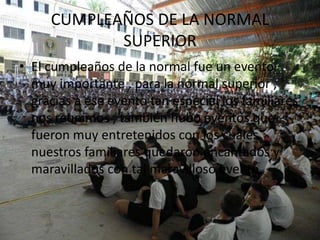 El documento describe un evento de cumpleaños para la Normal Superior en el que los familiares de los estudiantes se reunieron y participaron en actividades entretenidas que celebraron la importancia de la escuela.