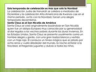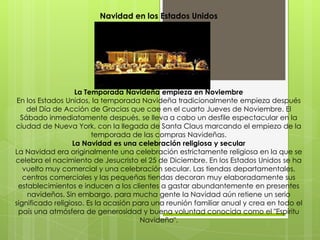 La temporada navideña en los Estados Unidos comienza tradicionalmente después del Día de Acción de Gracias, y se caracteriza por las compras, la decoración de árboles y casas con luces, y la celebración tanto de la Navidad cristiana como de otras fiestas como Hanukkah y Kwanzaa.