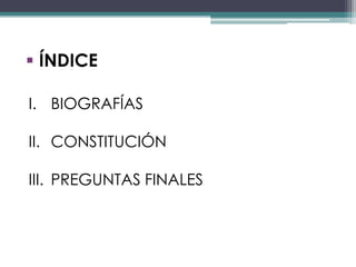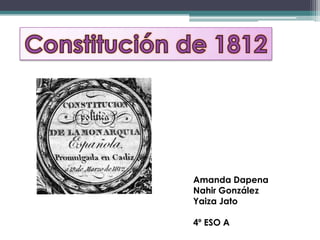 El documento presenta biografías de tres personajes históricos españoles: Fernández de Moratín, Francisco de Goya y Simón Bolívar. Luego resume los puntos principales de la Constitución de 1812 promulgada en Cádiz, como que estableció un gobierno unicameral y limitó los poderes del rey. Finalmente, hace algunas preguntas sobre la constitución y el proceso constituyente en Cádiz.