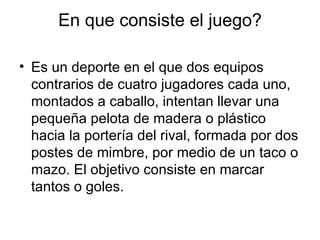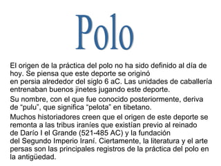 El polo se originó probablemente en Persia alrededor del siglo 6 aC, cuando las unidades de caballería lo jugaban para entrenar. Se cree que se remonta a las tribus iraníes previas al Imperio Persa. La literatura y el arte persas son los principales registros de la práctica del polo en la antigüedad.