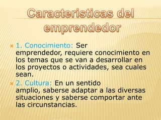 Para ser un emprendedor exitoso se requiere conocimiento sobre los temas del proyecto, cultura para adaptarse a diferentes situaciones, y la capacidad de asociarse con otros. También es importante tener visión para ver oportunidades donde otros ven problemas, generar ideas constantemente, asumir riesgos calculados, y la autocrítica para aprender de los errores.