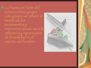 Este documento resume los aspectos fundamentales de la poesía. Explica que la poesía pertenece al género lírico y utiliza recursos como el sonido, ritmo y significado de las palabras. Además, describe que la poesía se divide en versos y estrofas que pueden llevar rima. Finalmente, presenta ejemplos de formas poéticas como el soneto, el romance y las coplas.