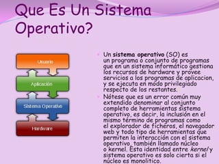 Este documento presenta información sobre sistemas operativos. Define un sistema operativo como un programa que gestiona los recursos de hardware y provee servicios a programas de aplicación. Explica las clases principales de sistemas operativos incluyendo DOS, UNIX, OS/2 y Windows. Provee detalles sobre DOS y Windows, describiendo a DOS como monotarea y monousuario y a Windows como desarrollado por Microsoft para PC.