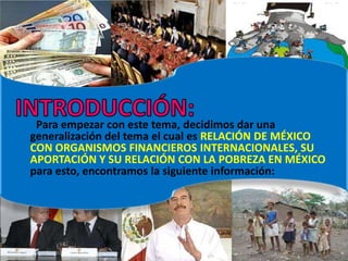 Este documento describe las relaciones de México con varias organizaciones financieras internacionales como el Banco Mundial, el Fondo Monetario Internacional y el Banco Interamericano de Desarrollo. Señala que aunque estas organizaciones reconocen las dificultades de México y le han brindado apoyo, sus acciones no han sido suficientes para establecer medidas que permitan el verdadero crecimiento del país. Debido a las altas deudas y intereses, México en realidad ha estado trabajando más para pagar sus deudas que para su prop