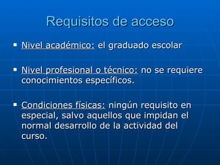 Este documento describe un curso de animador sociocultural. El curso no requiere ningún nivel académico o profesional específico. Se compone de 6 módulos que cubren técnicas de estudio de campo, planificación de programas, organización, evaluación, dirección de equipos y gestión. Cada módulo tiene objetivos y contenidos prácticos y teóricos relacionados con la profesionalidad del animador sociocultural.