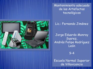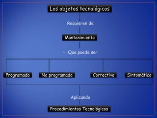 El documento habla sobre el mantenimiento adecuado de los artefactos tecnológicos. Explica que el mantenimiento puede ser programado, no programado, correctivo o sintomático y brinda ejemplos de cómo realizar el mantenimiento de objetos como televisores, computadoras, lavadoras, neveras y más para asegurar su funcionamiento y durabilidad.