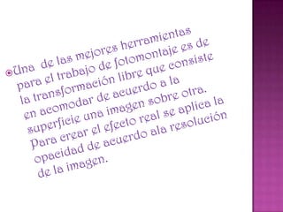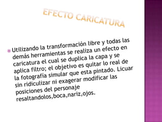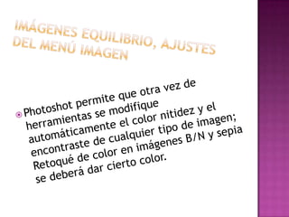 Este documento presenta ejemplos de técnicas de retoque fotográfico como equilibrio de blancos, ajustes de menú de imagen, efectos de caricatura y antiguas vs renovadas para la clase de Fotomontajes impartida por Alejandro Muñoz Gutiérrez al estudiante Monserrat Navarro Cardoso del grupo 3"A".