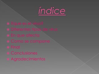 Este documento habla sobre los virus de computadora, sus graves consecuencias y cómo solucionarlos sin perder datos. Explica que un virus informático altera el funcionamiento de la computadora sin el permiso del usuario, afectando sistemas como Windows y Linux. También describe otros tipos de malware como troyanos y gusanos, y sus métodos de propagación. Por último, ofrece consejos sobre cómo prevenir infecciones mediante software antivirus y manteniendo actualizados los sistemas.