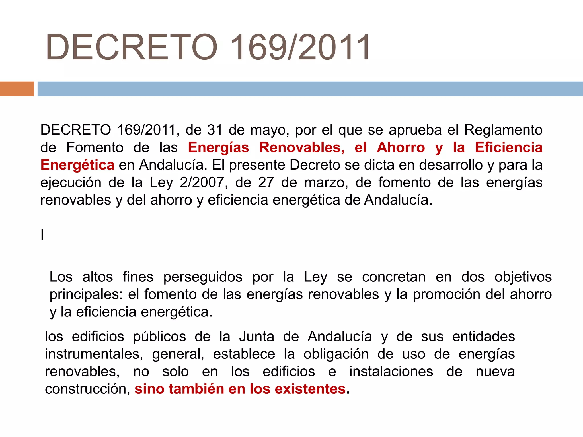 El decreto 169/2011 establece el reglamento para fomentar las energías renovables, el ahorro y la eficiencia energética en Andalucía, en concordancia con la ley 2/2007. Se imponen obligaciones para edificios nuevos y existentes en cuanto al uso de energías renovables, obtención de certificados energéticos, y se regulan planes de gestión para instalaciones de gran consumo energético. Además, se establece un sistema de control y sanciones para garantizar el cumplimiento de estas normativas.