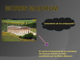 Las costumbres de los antepasados representaban un derecho consuetudinario basado en las tradiciones de las familias romanas. A lo largo de la época arcaica, los mores maiorum, o costumbres de los antepasados, fueron respetados de generación en generación y constituían las reglas fundamentales de convivencia en Roma. El derecho romano tuvo origen en las costumbres y tradiciones antes de ser codificado formalmente.
