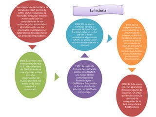 Internet es una red descentralizada de redes interconectadas que utilizan protocolos TCP/IP para funcionar como una red lógica global. Se originó en la década de 1960 en ARPA para permitir que investigadores compartieran recursos de computación entre universidades, evolucionando desde entonces para incluir miles de redes y protocolos que permiten a miles de millones de usuarios acceder a información de todo el mundo.