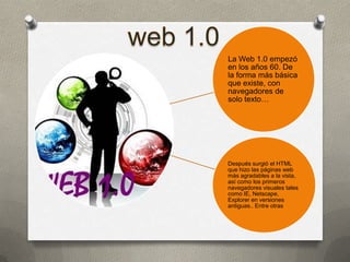 El documento describe la evolución de la Web desde la Web 1.0 hasta la Web 3.0, explicando que la Web 1.0 consistía principalmente en páginas web de solo texto y primeros navegadores, la Web 2.0 enfatizó la interacción de los usuarios y contenido generado por los usuarios, y la Web 3.0 permitirá que la información sea gestionada de manera más precisa según las necesidades del usuario.