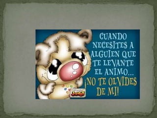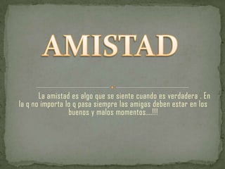 El documento presenta información sobre la amistad, definiéndola como una relación afectiva entre dos o más personas que se demuestra en la preocupación mutua y apoyo en los buenos y malos momentos. Un verdadero amigo está siempre presente para levantar el ánimo.