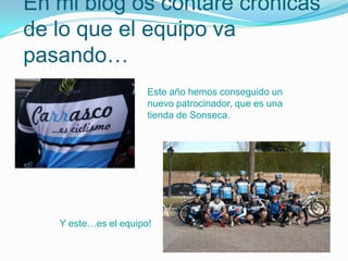 Este resumen describe un blog sobre un equipo de bicicleta de montaña que está compitiendo en el Open BTT de Ciudad Real. El blog informará sobre las carreras y clasificaciones del equipo, incluidos los líderes en categorías individuales y por equipos. También incluirá secciones sobre consejos de mecánica, noticias de otros circuitos y la Copa de España.