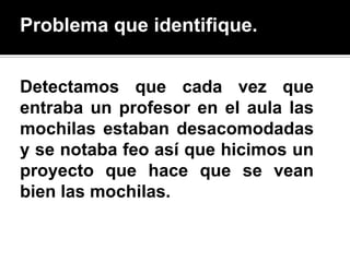 El equipo detectó que las mochilas se veían desordenadas cuando los profesores entraban al aula. Como solución, construyeron una repisa de madera y metal para colocar ordenadamente las mochilas. Alternativamente, podrían usar un perchero en la pared. El proyecto les enseñó a trabajar en equipo y crear algo útil para el aula.