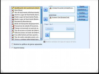 Este documento presenta dos ejercicios que analizan la relación entre variables cualitativas utilizando la prueba de chi-cuadrado. El primer ejercicio encuentra una relación significativa entre tener cansancio en el rol de cuidador y el sexo. El segundo ejercicio no encuentra una relación significativa entre la unidad docente y el estado civil.