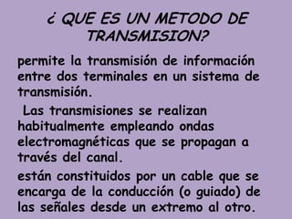 Este documento describe diferentes métodos de transmisión de información como cables de par trenzado (UTP, FTP, STP), cable coaxial (grueso y delgado) y fibra óptica (monomodo y multimodo). Cada método se caracteriza por el tipo de conductor utilizado, la velocidad de transmisión, distancia máxima y facilidad de instalación. Los cables de par trenzado son los más comunes para redes locales mientras que la fibra óptica permite mayores distancias.