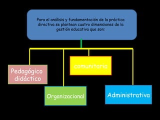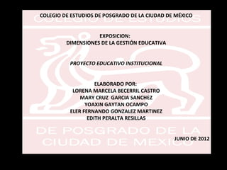El documento presenta las cuatro dimensiones de la gestión educativa consideradas en el Proyecto Educativo Institucional del Colegio de Estudios de Posgrado de la Ciudad de México: la dimensión pedagógica, didáctica, comunitaria y administrativa. Describe cada dimensión y los elementos que las componen, así como su importancia para el análisis y fundamentación de la práctica directiva y la conformación de la identidad institucional.