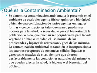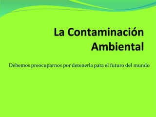 El documento habla sobre la contaminación ambiental, definida como la presencia de agentes físicos, químicos o biológicos en el ambiente que pueden ser dañinos para la salud humana, animal o vegetal. Explica los tipos principales de contaminación como la del agua, suelo y aire, y propone formas de prevenirla como no quemar plantas, regular el uso de fertilizantes, no botar basura indebidamente y controlar derrames industriales, para proteger el futuro del planeta.