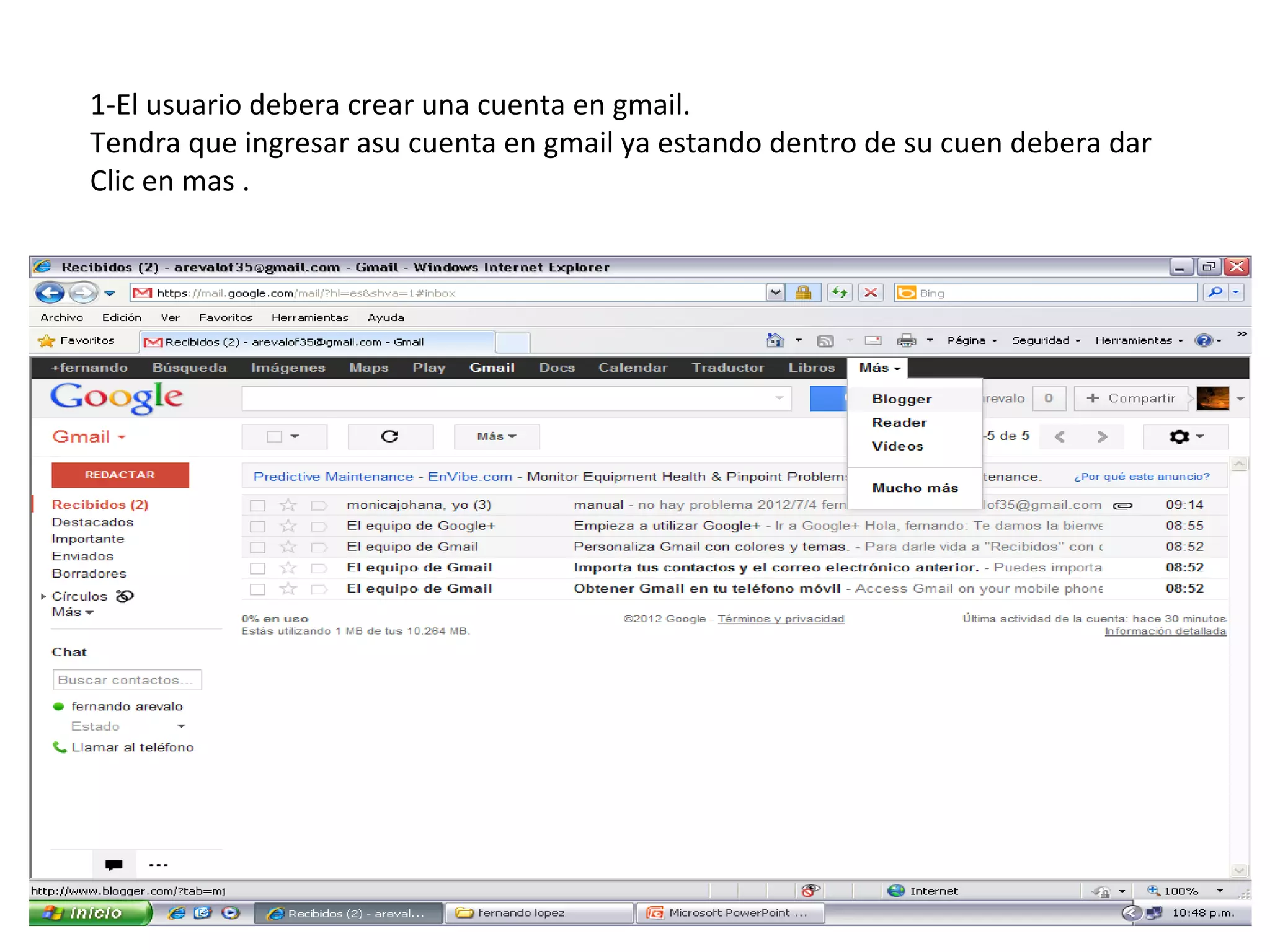 El documento proporciona 7 pasos para crear un blog en Blogger usando una cuenta de Gmail. Estos incluyen crear una cuenta de Gmail, acceder a Blogger a través de la cuenta, seleccionar una plantilla, asignar un nombre y dirección URL al blog, y empezar a publicar contenido.