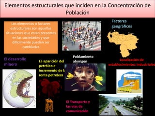 Este documento describe los elementos estructurales y coyunturales que inciden en la concentración de población y la tasa de desempleo en Venezuela. Entre los elementos estructurales se encuentran factores geográficos, el desarrollo minero, la industria petrolera y el transporte. Los elementos coyunturales incluyen políticas de desconcentración urbana, descentralización, ciclos económicos y legislación laboral. El documento analiza cómo estos factores afectan la distribución de la población y las tasas de emple