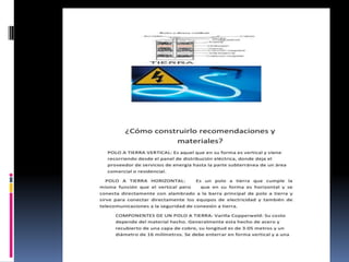 Este documento describe cómo instalar un sistema de puesta a tierra para proteger equipos eléctricos. Explica que se debe hacer un hueco en la tierra, llenarlo parcialmente con bentonita y arena, e insertar varillas de cobre o hierro. También menciona la importancia de que los tomacorrientes tengan puesta a tierra y recomienda usar reguladores de voltaje o UPS para proteger los equipos eléctricos.