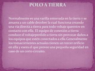 Un polo a tierra es una varilla de cobre enterrada en la tierra que conecta equipos eléctricos a tierra para desviar voltaje perdido y evitar daños. Los polos a tierra horizontales conectan equipos directamente a la barra principal de polo a tierra, mientras que los verticales recorren desde el panel de distribución eléctrica hasta el suelo. Un telurímetro mide la resistencia del polo a tierra para asegurar que esté correctamente instalado e inferior a 10 ohmios.
