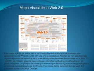 Este documento presenta un mapa visual de los principales conceptos relacionados con la Web 2.0, incluyendo una breve explicación de cada concepto y ejemplos de servicios hispanos y globales populares. También incluye un glosario de tecnologías y acrónimos asociados con la Web 2.0. El mapa forma parte de un libro sobre la Web 2.0 publicado por la Fundación Orange.