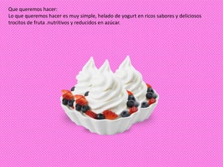 El documento presenta un resumen de un proyecto de emprendimiento para crear un negocio de helados de yogurt llamado "Vamalu". El proyecto será llevado a cabo por tres estudiantes del Colegio de San José de la Salle en Medellín, Colombia. Planean fabricar helados de yogurt nutritivos y de bajo contenido de azúcar con trozos de fruta. Detallan sus planes para la promoción, ubicación, inicio de operaciones, recursos disponibles, objetivos y clientela del negocio. También incluyen un presupuesto inicial