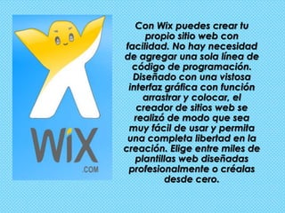Este documento describe cómo crear un sitio web fácilmente con Wix sin necesidad de escribir código. Wix tiene una interfaz gráfica intuitiva que permite arrastrar y soltar elementos para diseñar páginas web. Los usuarios pueden elegir entre miles de plantillas profesionales preestablecidas o crear sus propios diseños personalizados.