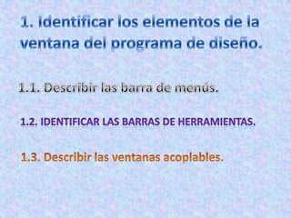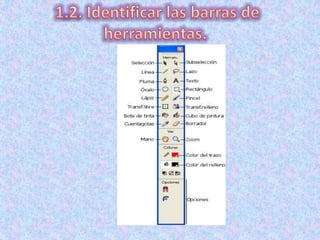 El documento describe las barras de menús y herramientas en Adobe Flash. La barra de menús contiene opciones como Archivo, Edición, Insertar y Modificar. El panel de herramientas incluye herramientas para dibujar, seleccionar, transformar y modificar objetos. También describe las ventanas acoplables que contienen herramientas y opciones para editar la animación.