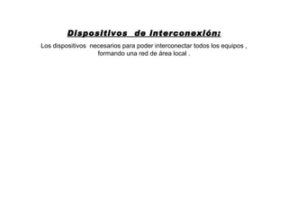 Los dispositivos necesarios para interconectar equipos en una red local incluyen tarjetas de red, cables Ethernet o WiFi, y concentradores como hubs, switches o puntos de acceso que conectan los cables o transmiten señales inalámbricas. Los routers gestionan direcciones IP, conectan diferentes redes y proporcionan acceso a Internet.