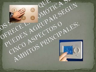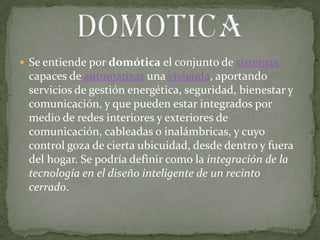La domótica permite automatizar una vivienda para gestionar la energía, seguridad, confort y comunicaciones. Esto se logra mediante redes internas que conectan sensores, actuadores y una central de gestión, permitiendo el control desde dentro y fuera del hogar. El objetivo es integrar la tecnología de forma inteligente para ahorrar energía, mejorar el confort y la seguridad.