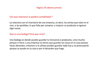 Este documento resume las páginas 19, 20 y 21 de un trabajo de emprendimiento sobre contabilidad. Explica que los libros de contabilidad son obligatorios por ley para que las empresas puedan hacer un seguimiento cronológico de sus operaciones y realizar inventarios anuales. Define una bodega como un lugar para almacenar mercancía y productos. Además, describe los diferentes tipos de libros de contabilidad como los diarios, mayores e inventarios, y sus propósitos.