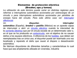 Este documento describe diferentes elementos de protección eléctrica como breakers, UPS y tomas. Explica que los breakers interrumpen el circuito eléctrico cuando la corriente excede un valor determinado para evitar daños, a diferencia de los fusibles que solo se pueden usar una vez. También describe que las UPS incluyen un estabilizador de tensión y baterías internas para proteger equipos de variaciones de voltaje y proveer energía en caso de cortes, y los beneficios de usar una UPS.