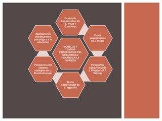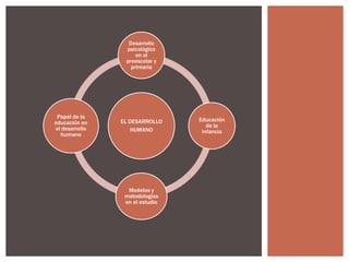 El documento presenta una introducción al desarrollo psicológico infantil, incluyendo las teorías de Freud, Erickson, Piaget, Vygotsky y los conductistas. Analiza factores que influyen en el desarrollo como la educación, familia y cultura. Finalmente, discute el papel de la escuela y maestros en promover el desarrollo a través de programas educativos e intervenciones.